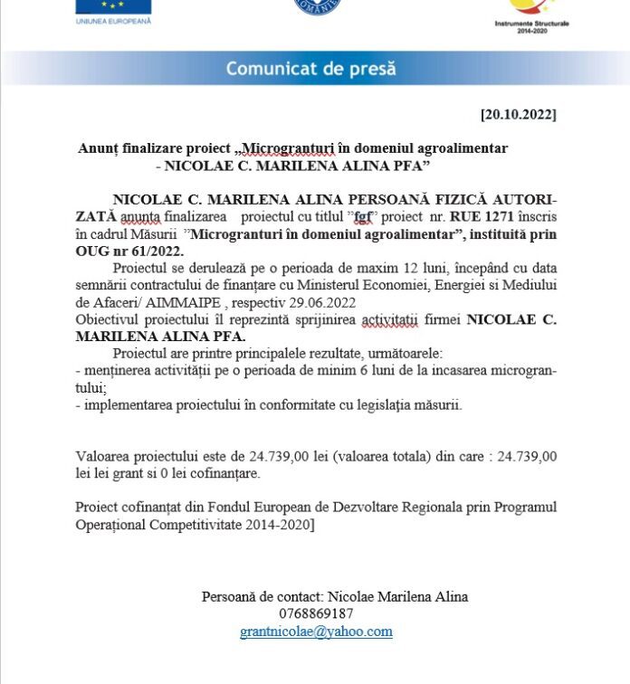 AcasăPublicitateAnunț finalizare proiect „Microgranturi în domeniul agroalimentar - NICOLAE C. MARILENA ALINA...