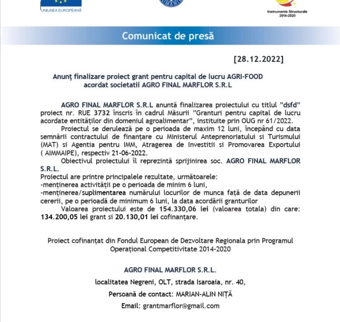 AcasăPublicitateAnunţ finalizare proiect grant pentru capital de lucru AGRI-FOOD acordat societatii AGRO... Publicitate Anunţ finalizare proiect grant pentru capital de lucru AGRI-FOOD acordat societatii AGRO FINAL MARFLOR S.R.L By adevaruldinoltenia 28 decembrie 2022 Acțiune FacebookTwitterPinterestWhatsApp Acțiune FacebookTwitterPinterestWhatsApp Articolul precedentCRĂCIUN FERICIT !Articolul următorLA MULTI ANI! adevaruldinolteniahttps://www.adevaruldinoltenia.ro ARTICOLE SIMILARE Publicitate ANUNȚ 12 februarie 2026 Publicitate ANUNȚ 16 decembrie 2025 Publicitate Și tu îl poți ajuta pe Moș Crăciun! 20 noiembrie 2025 LĂSAȚI UN MESAJ Renunțați la răspuns Comentariu: Vă rugăm să introduceți comentariul dvs.! Nume:* Introduceți aici numele dvs. Email:* Ați introdus o adresă de e-mail incorectă! Vă rugăm să introduceți adresa dvs. de e-mail aici Website: Salvați numele meu, adresa de e-mail și site-ul web în acest browser pentru data viitoare i comentariu. - Advertisment - Cele mai populare Casele de pe strada Grădiște nu au autorizație de construire. Primăria Slatina pregătește terenuri pentru a ajuta familiile să intre în legalitate 4 martie 2026 Mario De Mezzo, măsuri imediate pentru persoanele afectate în urma alunecării de teren de pe strada Grădiște 4 martie 2026 Emil Albotă, prefectul județului Olt: ”Oamenii sunt în siguranță” 4 martie 2026 Noi investiții pentru Scornicești. A fost semnat ordinul pentru începerea lucrărilor 4 martie 2026 Încărcați mai multe Comentarii recente KidsZone pe Încă un proiect finalizat în comuna Găneasa Fuzzy pe O casă a luat foc în comuna Pleșoiu DYI pe Consultații oftalmologice gratuite pentru locuitorii din Osica de Jos