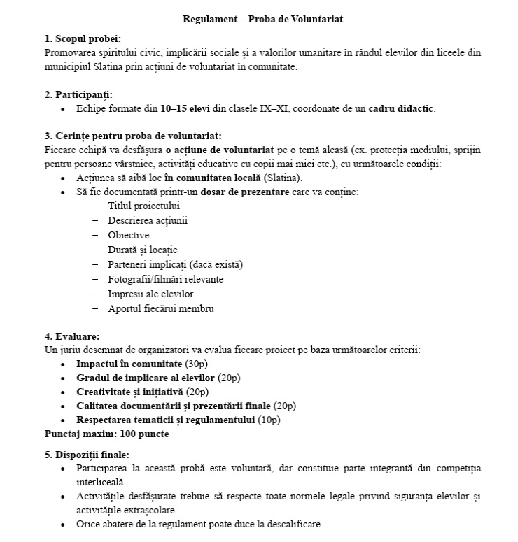 ”Pentru municipiul Slatina, organizarea acestui program este o ocazie de promovare a tinerilor, a educației, a sportului și a colaborării între instituțiile școlare, administrația locală și societatea civilă. Evenimentul contribuie la consolidarea unei comunități moderne și dinamice și poate deveni o tradiție locală anuală, întărind sentimentul de apartenență și mândrie locală. Ținând cont de: – implicarea Consiliului Local și a Primăriei municipiului Slatina în susținerea performanței școlare și extrașcolare, prin recompense simbolice și recunoaștere publică; – prevederile H.C.L. nr. 128/14.04.2025 privind aprobarea programului „Programe și proiecte culturale, educative și manifestări sportive pe anul 2025”, în cadrul căruia a fost prevăzută desfășurarea programului „Olimpiada Liceelor”;