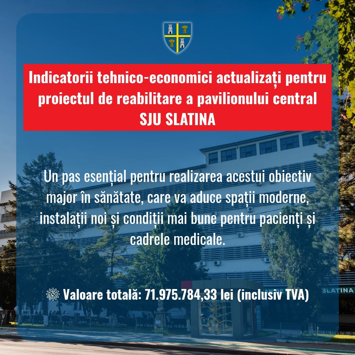 ”Această actualizare este un demers tehnic necesar, rezultat al modificărilor legislative și al creșterii TVA, care va permite scoaterea la licitație și, implicit, continuarea procesului de implementare. Este un pas esențial pentru realizarea acestui obiectiv major în sănătate, care va aduce spații moderne, instalații noi și condiții mai bune pentru pacienți și cadrele medicale”, transmite Virgil Deruleanu, vicepreședinte CJ Olt.