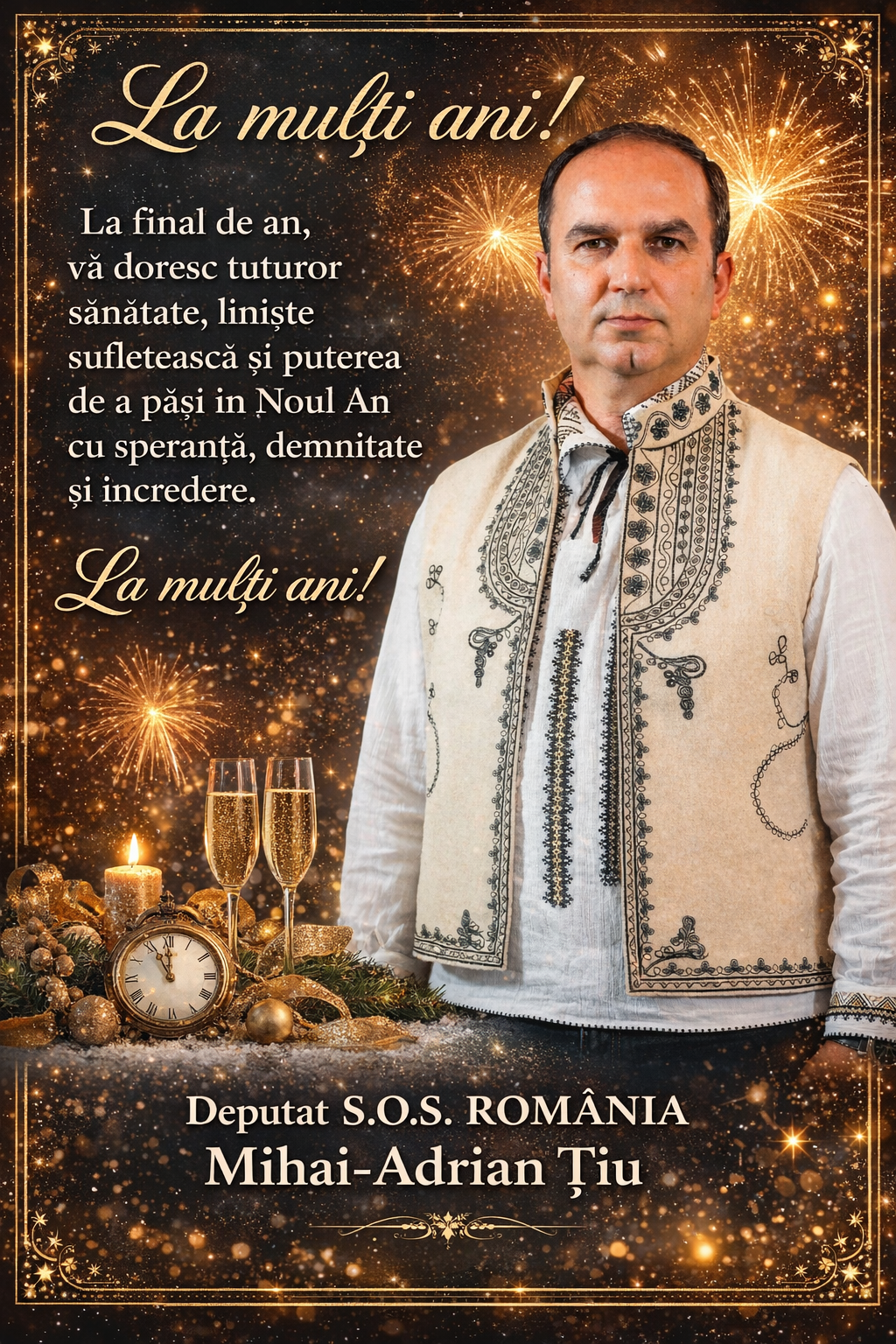 ”În fața Anului Nou, privesc cu responsabilitate și cu hotărâre pentru că, drepturile cetățenilor României nu se negociază și nu se sacrifică pentru interese de moment. Voi rămâne la fel de implicat, la fel de prezent și la fel de obiectiv în apărarea drepturilor fiecărui român. Fără ezitare și fără compromisuri. Vocea oamenilor va fi auzită în continuare în Parlament, mai presus de orice presiune politică sau instituțională.
